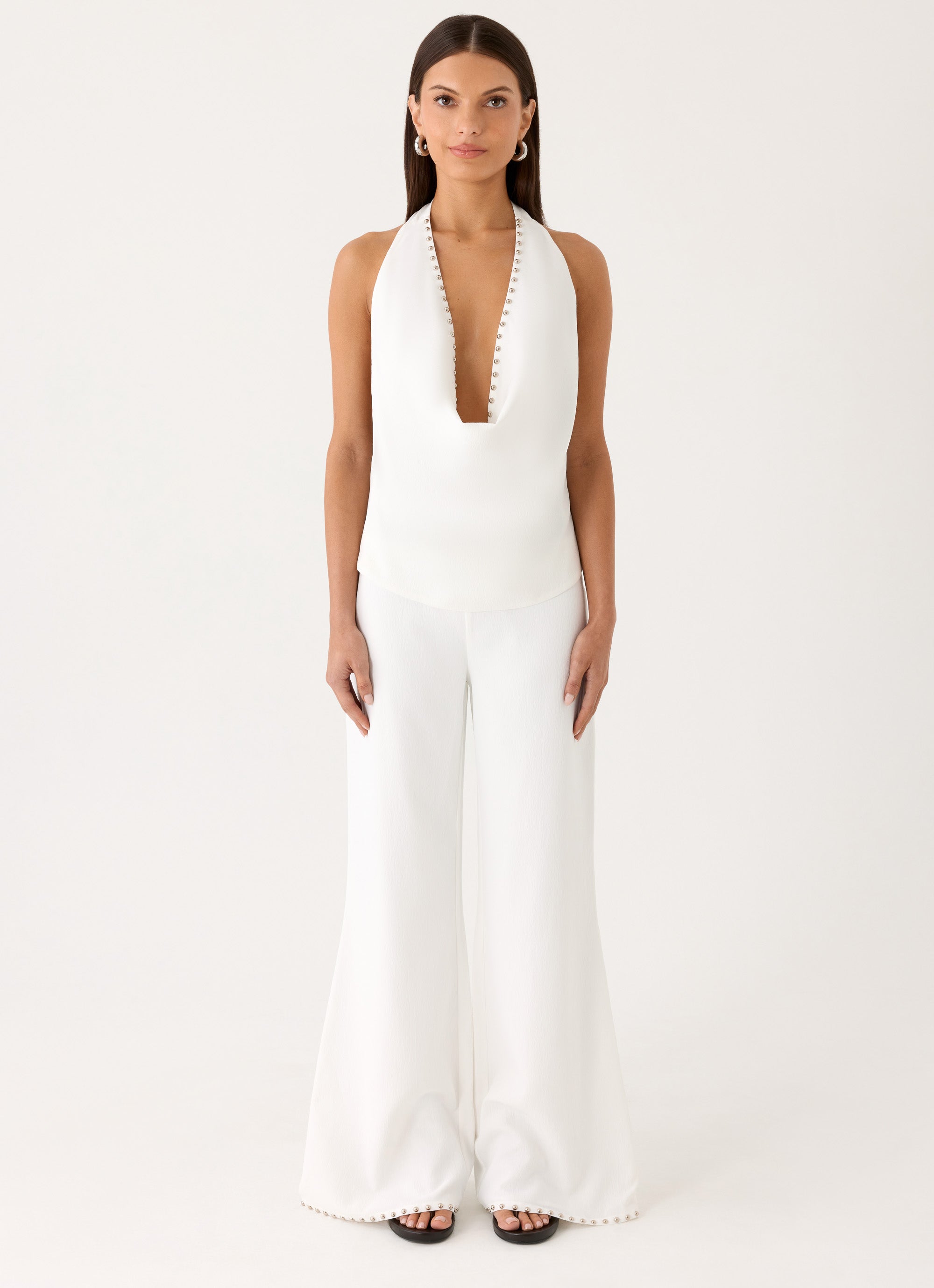 The Ashika Studded Top is made for sun-soaked days that turn into sparkling nights. Featuring a cowl neckline, studded trim detail, and halter neck with adjustable sash tie, its low back and fully lined silhouette sculpt a confident, editorial shape perfect for golden hour glamour.