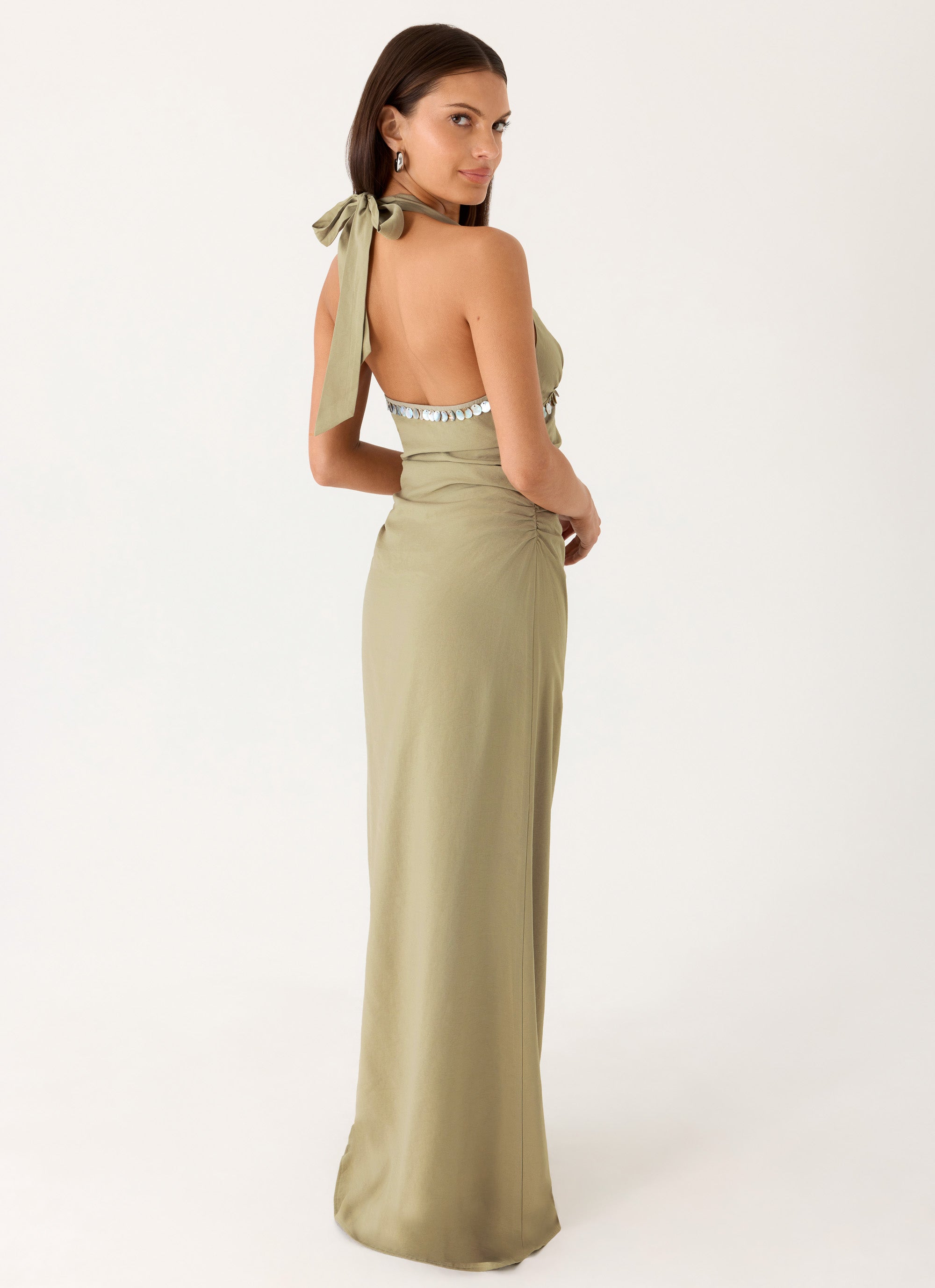 The Lorela Maxi Dress is made for sun-drenched days that glide into golden hour evenings. Featuring a halter neckline, under-bust seam, and hand-beaded shell detail, it flows effortlessly in a maxi length while an invisible side zip ensures a sleek, polished finish. Perfect for a confident, editorial summer silhouette.