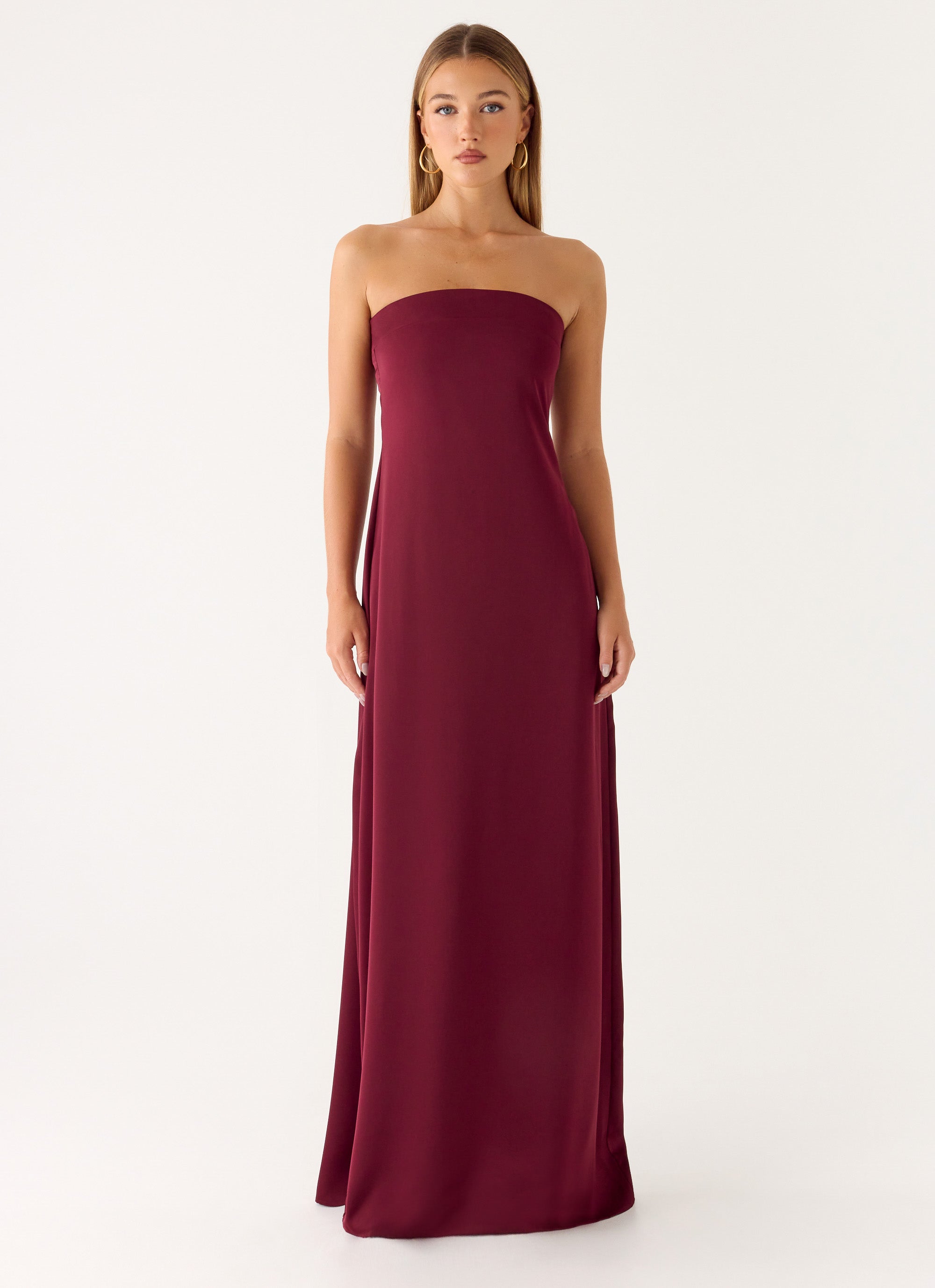 The Jiana Maxi Dress is an effortlessly elegant strapless silhouette made to flow with every movement. Its sleek, fitted shape and invisible side zipper create a polished finish, while luxe satin adds a subtle sheen perfect for golden-hour to evening occasions.