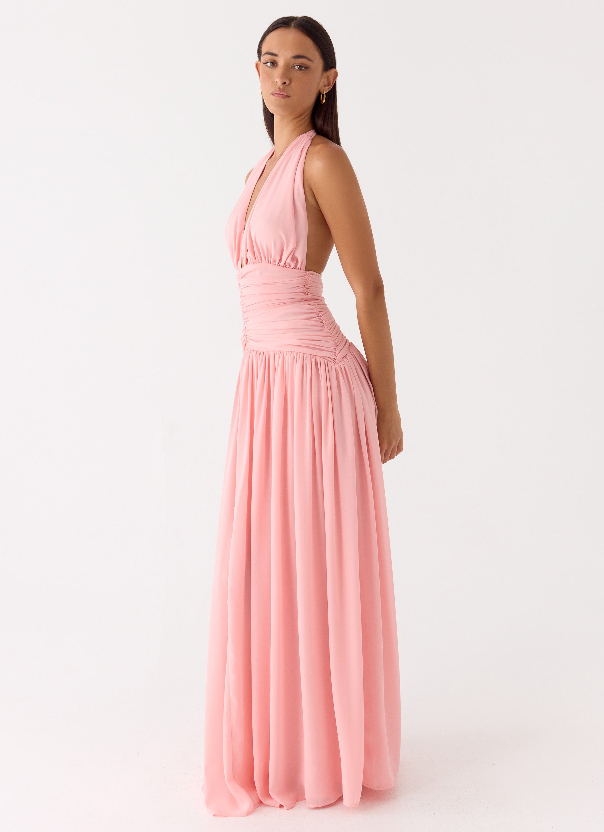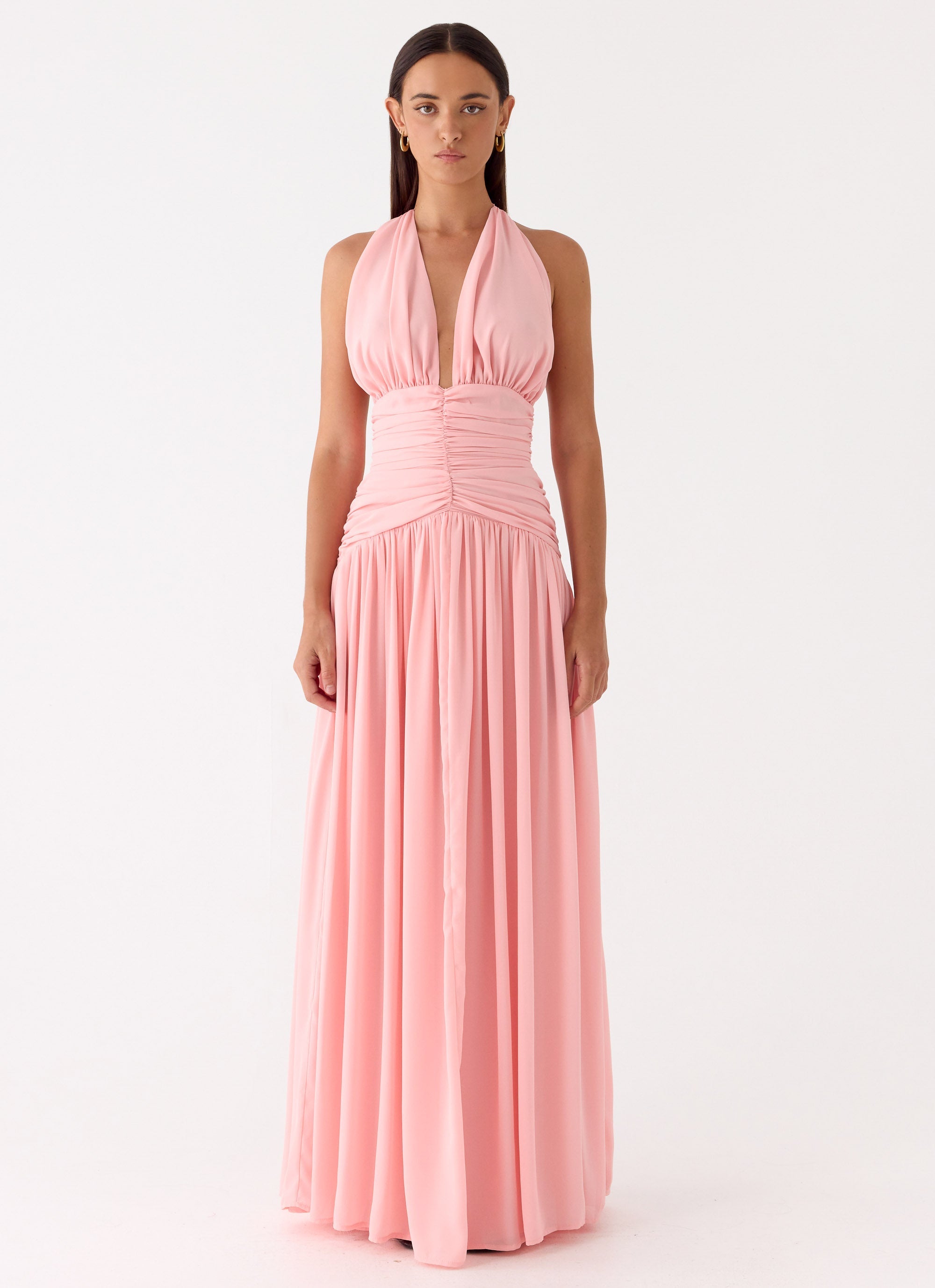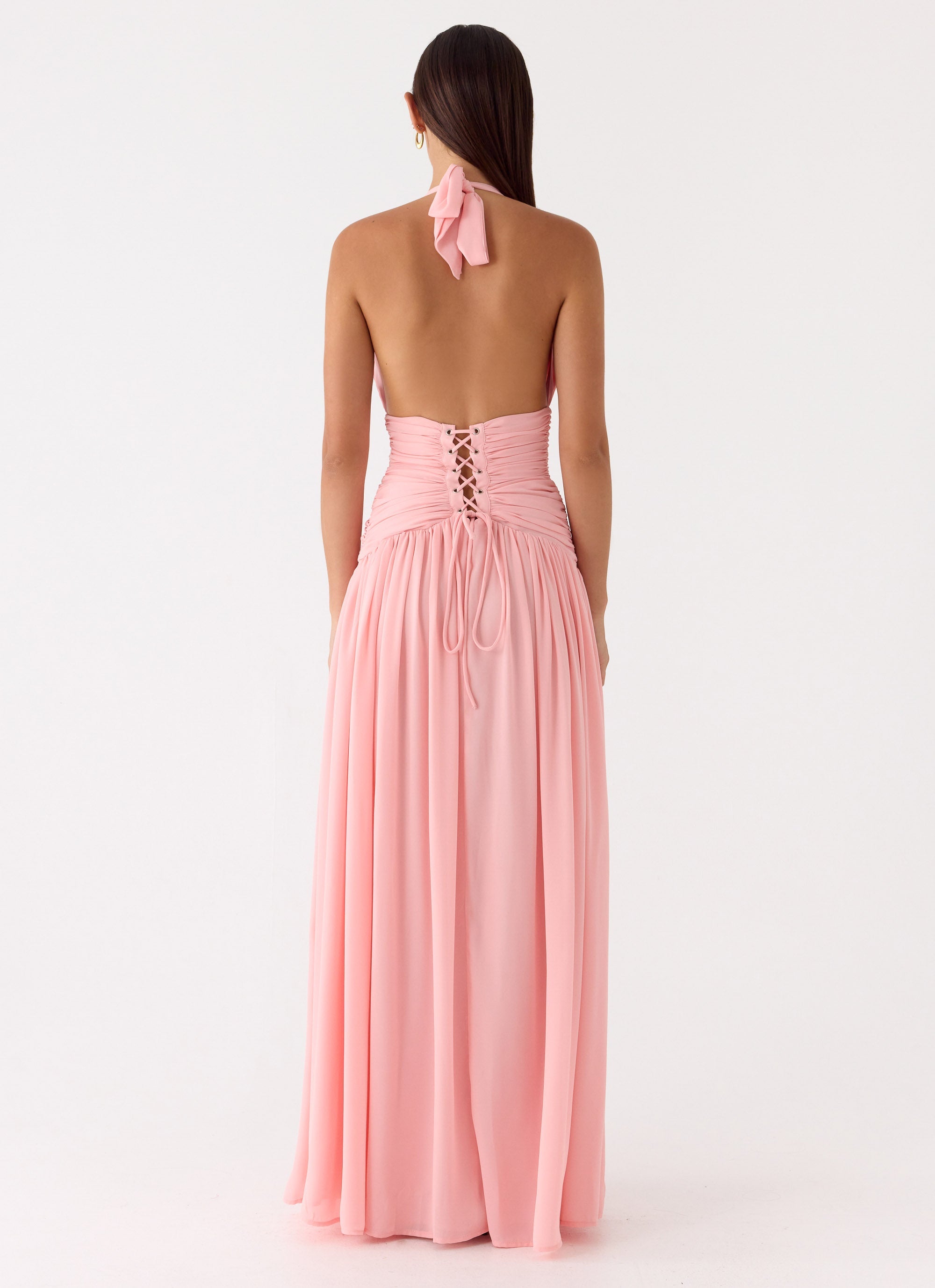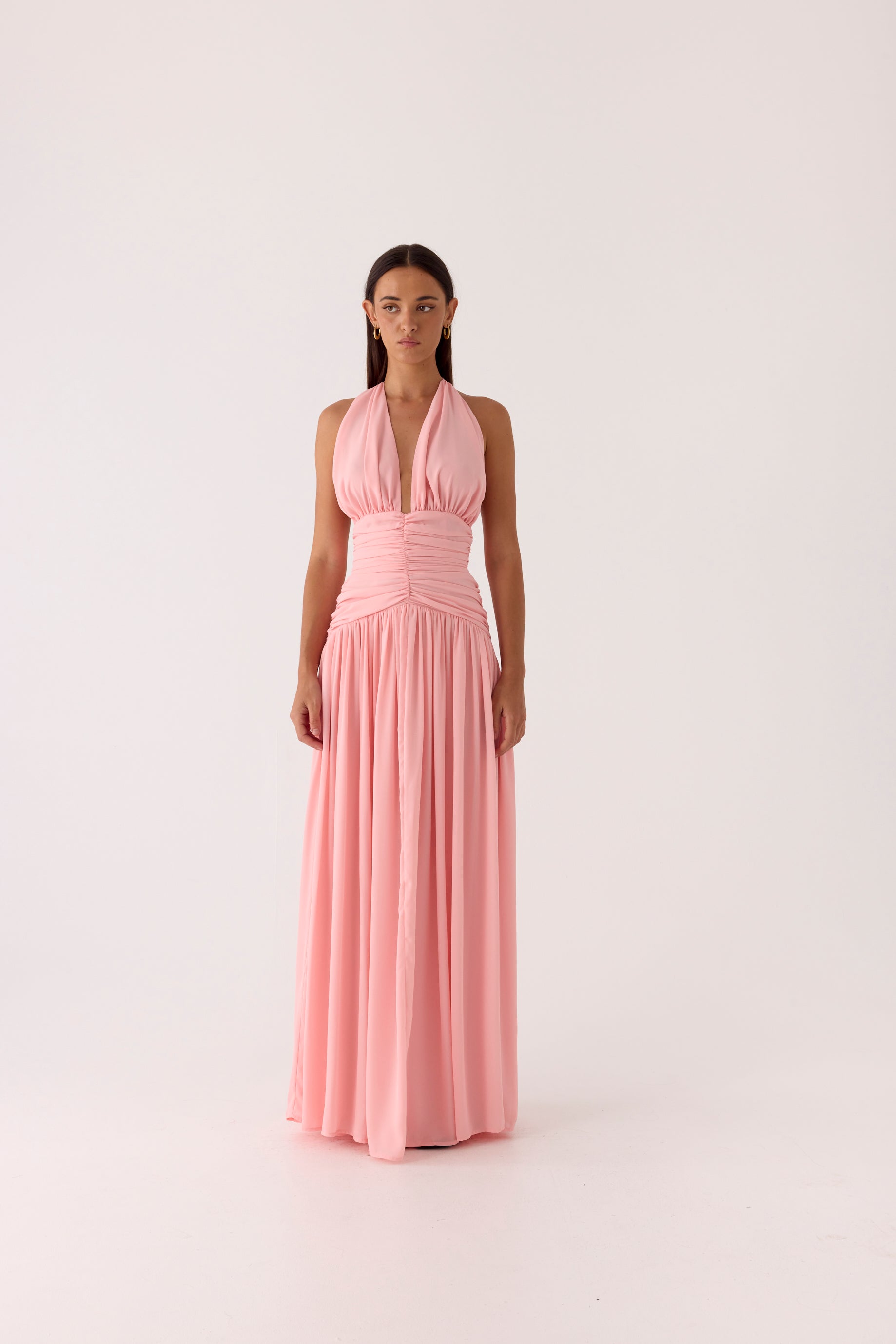 The Jimena Maxi Dress is designed for statement elegance with its deep plunge neckline and halter silhouette featuring a thick adjustable strap. The ruched bodice sculpts the waist, while the floor-grazing chiffon skirt flows effortlessly. Back eyelets with lace-up detailing and a fully lined finish complete this dramatic, long-fitting style.
