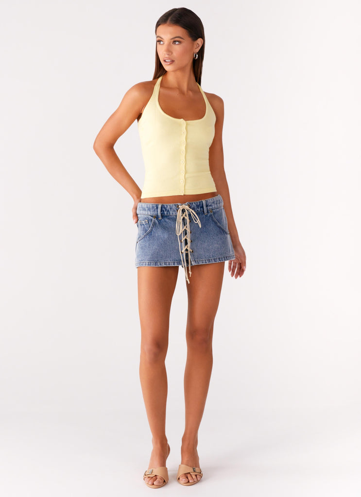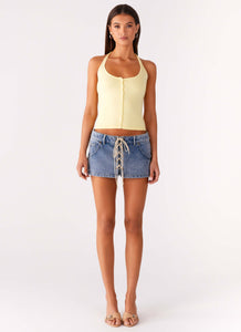 The Nashville Denim Skort is made for effortless nights out. Featuring a low rise and mini length, this skort includes front tie detailing, belt loops, twin front slanted pockets, and a front hook and zipper closure. Finished with back twin patch pockets for a classic touch.