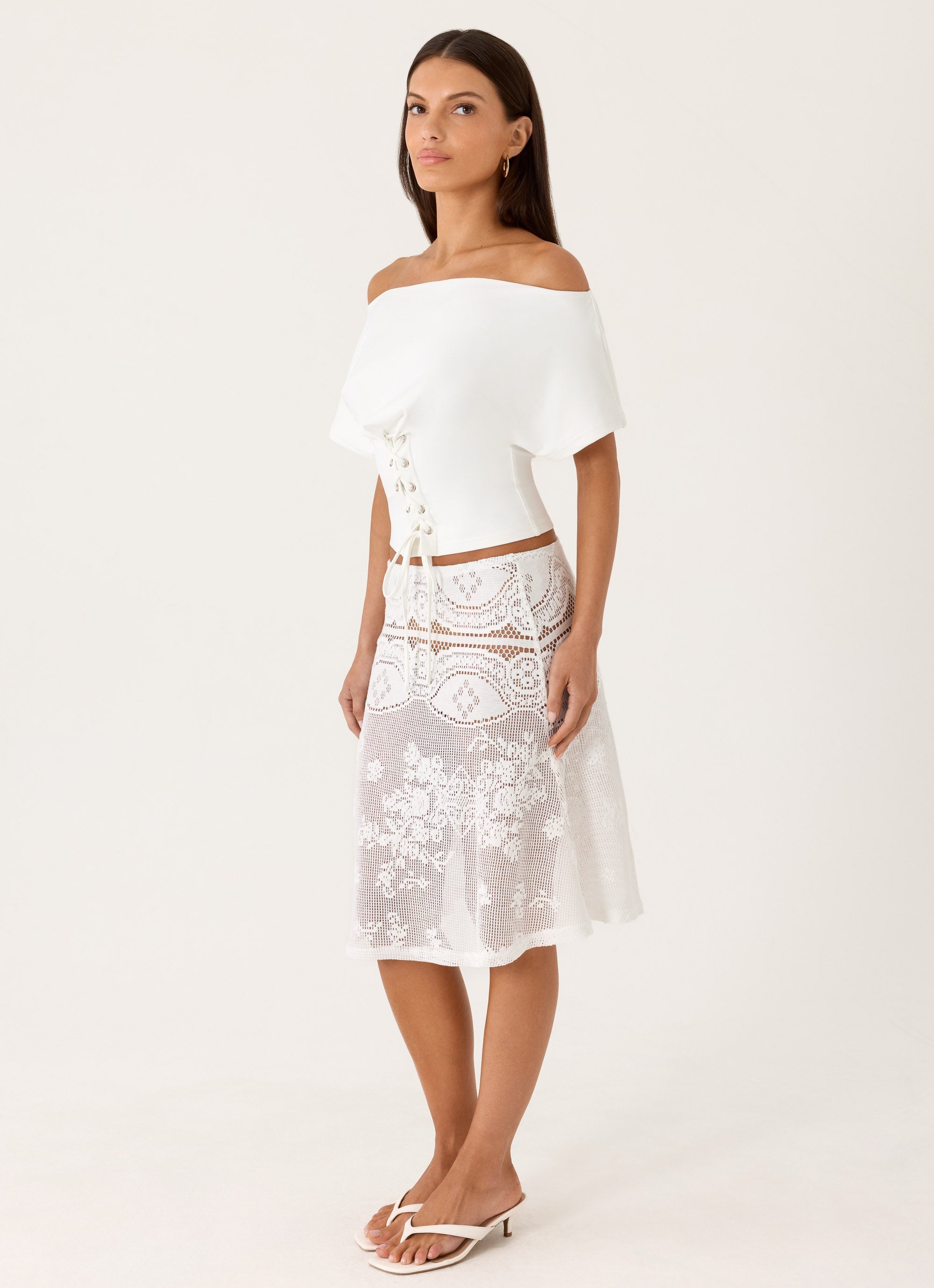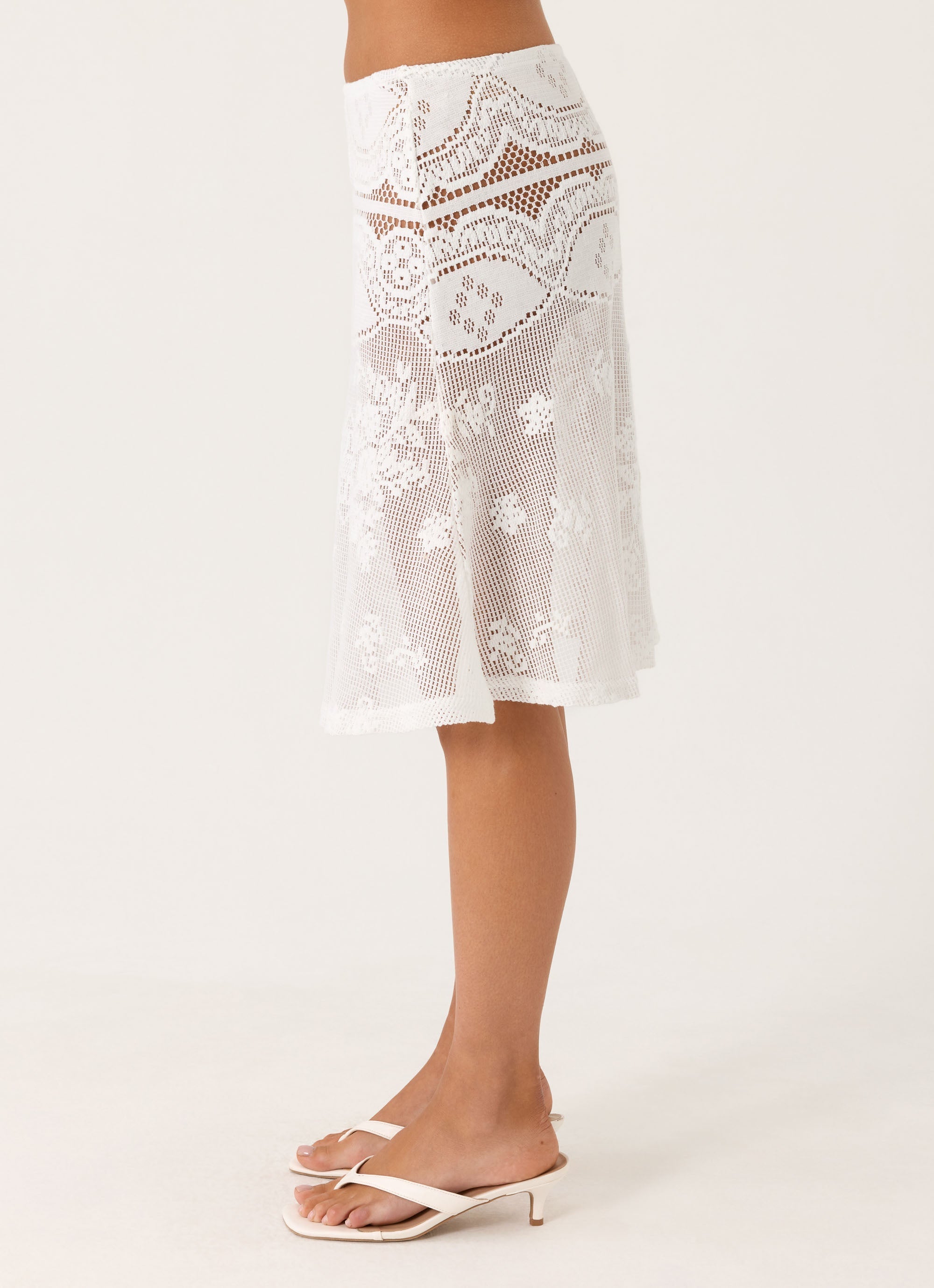 The Yanna Midi Skirt is made for golden hour moments that linger into balmy nights. Featuring a low-rise silhouette, elasticated waist, and delicate lace fabric, it drapes effortlessly with a flowing midi length for an easy, feminine feel. Perfect for sunlit strolls and evening escapes.